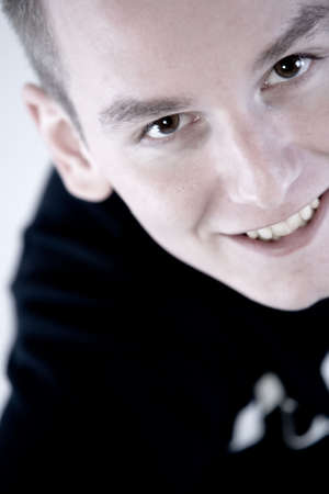 Close up portrait of young man with striking blue eyes looking at camera against neutral background, copy space