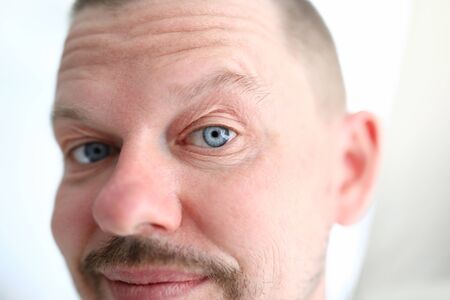 Close-up of middle-aged male posing on camera indoors. Person with mustache. Adult with attractive blue eyes. Funny man with wrinkles. Model and beauty concept