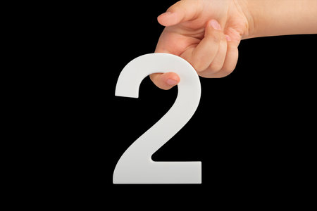 number two in hand isolated on black background. Number two white in a childs hand on a black background. For inserting into a project or design.