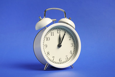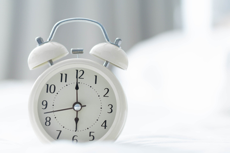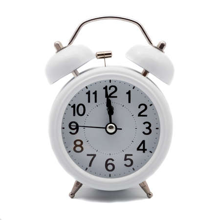 Minimalist white alarm clock with twin bells, classic design, time clearly visible against neutral background