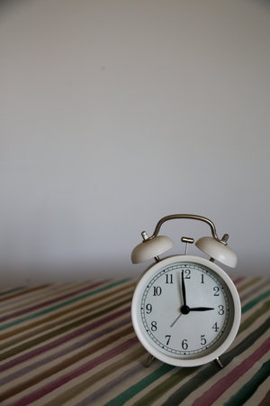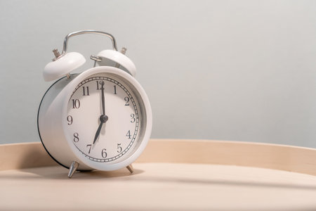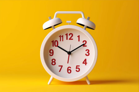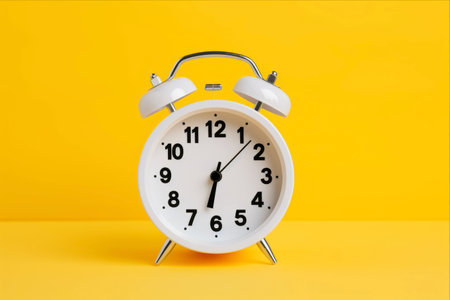 a round alarm clock stands on a white table, half past seven in the morning. Yellow background