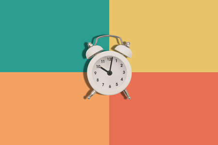 white circle retro classic analog alarm clock with clock needle isolated on yellow empty background with copy space. time management concept.