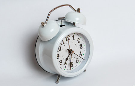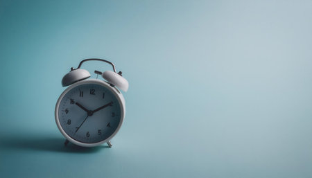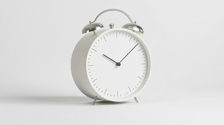 A classic alarm clock with a white finish stands alone on a muted background, embodying simplicity and the concept of passing time.