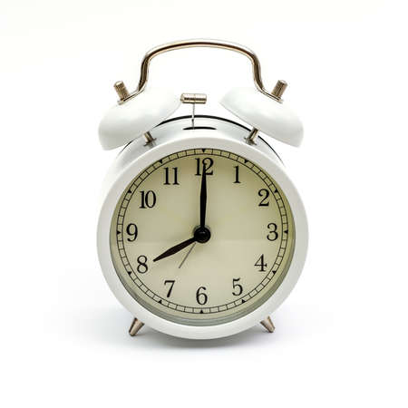 Simply flat lay design Ringing twin bell vintage classic alarm clock Isolated on white background. Rest hours time of life good morning night wake up awake concept. Flat lay top view copy space