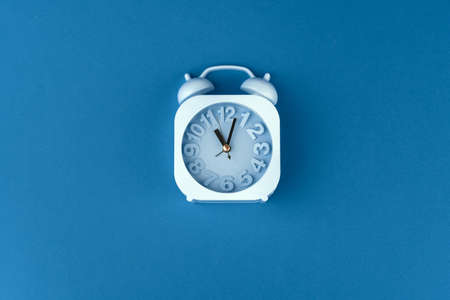 Blue alarm clock on a blue background. Shot from above. Space for text. Copy space