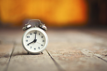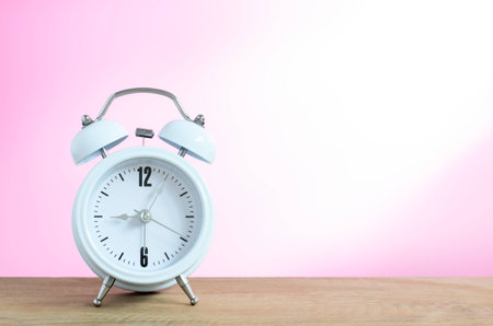 Small white alarm clock, black numbers, set the time for 10.10 o'clock, placed on a wood table.