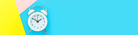 Banner. Ringing twin bell classic alarm clock isolated on blue yellow pink colorful geometric background. Rest hours time of life good morning night wake up awake concept. Flat lay top view copy space