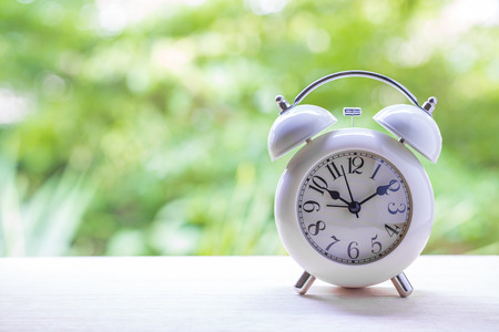 Selective focus of alarm clock show 8 o'clock or 8 a.m. on table with nature bokeh background. Time in life concept.