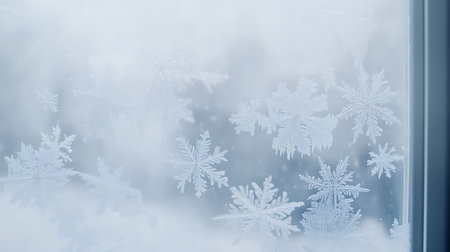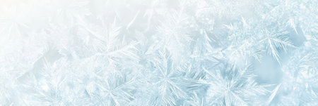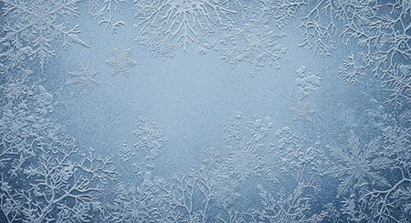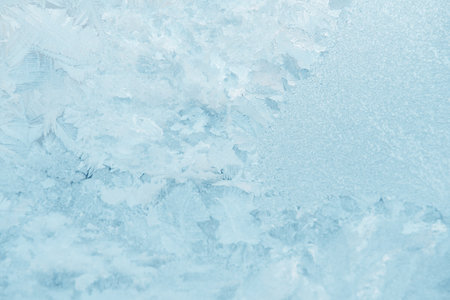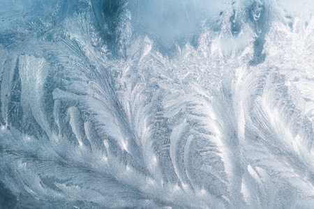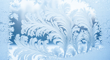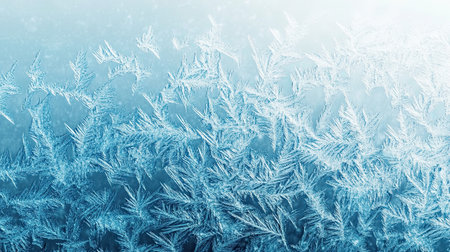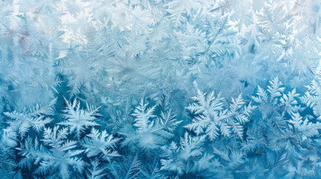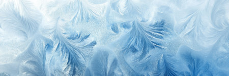 Captivating frost patterns create a stunning winter background in soft blue tones. Perfect for seasonal projects, designs, or nature-themed artwork.