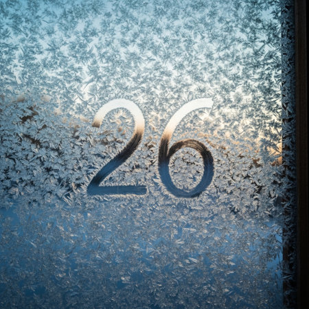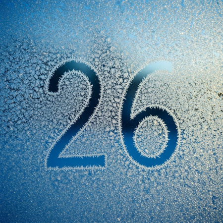 Frosty natural pattern on winter window glass with blue background and number 26