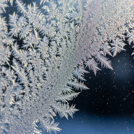 Close-up image of a frosted window pane showcasing intricately snow frost patterns formed by natural winter processes. The delicate icy shapes stand out against a muted winter background,
