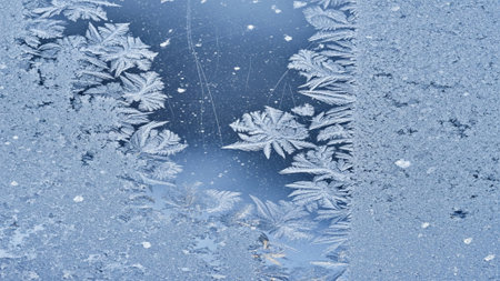 Intricate frost formations cover the glass, displaying beautiful icy designs and reflecting the chill of a winter morning. A serene scene that captures the essence of cold weather.