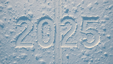 aerial shot of 2025 carved into the snow, showing tracks and a cold, winter landscape