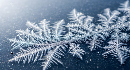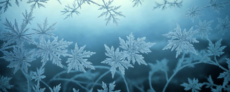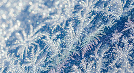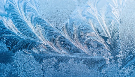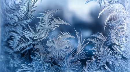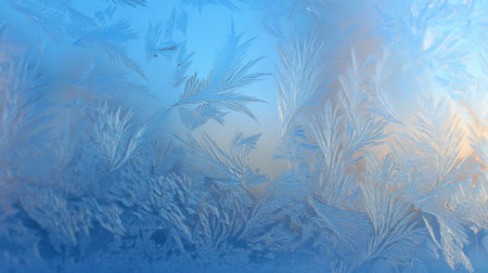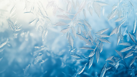 Captivating frost patterns adorn a serene winter scene, showcasing delicate ice crystals against a soft blue background, evoking tranquility and beauty.