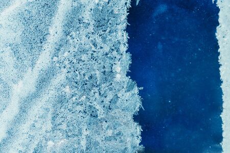 Blue ice crystals forming frame on frozen surface. Macro of snowflakes and frostwork for holiday or new year design