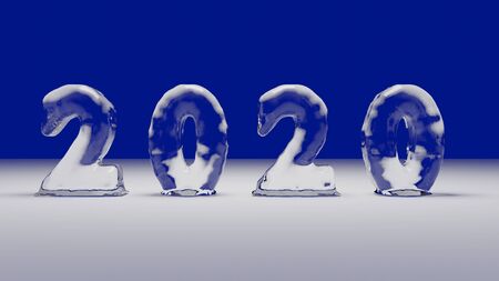 Ice font 2020 new year's. At abstract blue background, up banner for display of product. Celebration festive greeting card. 3D rendering.