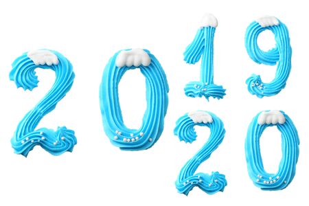 Happy New Year 2020. Number 2020 made of blue sweets. Creative typography, banner design. Sweet winter dessert ingredients