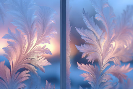 Intricate frost patterns on a window, illuminated by soft morning light, showcasing the beauty of winter and nature's delicate artistry in a tranquil setting