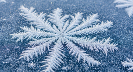 A detailed macro shot of a delicate, ice crystal snowflake with intricate fractal patterns on a dark, textured background.