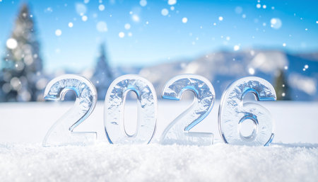 The year 2026 is depicted in glowing ice digits on a snowy background.