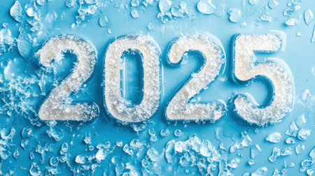 Frosty 2025 numeral covered in ice and frozen droplets, symbolizing the arrival of a new year and winter celebrations with a chilly blue background.