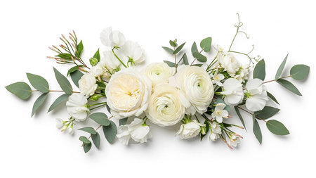A delicate arrangement of white roses, ranunculus, eucalyptus leaves, and jasmine sprigs creating a soft, floral composition on white.