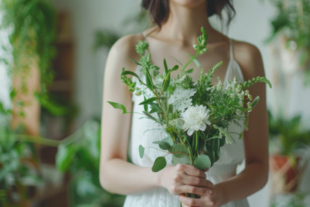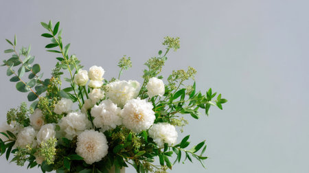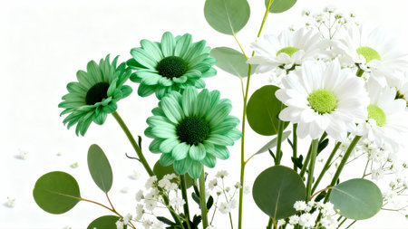 This stunning floral arrangement showcases delicate white flowers and lush green leaves on a soft green background, perfect for nature-inspired designs.