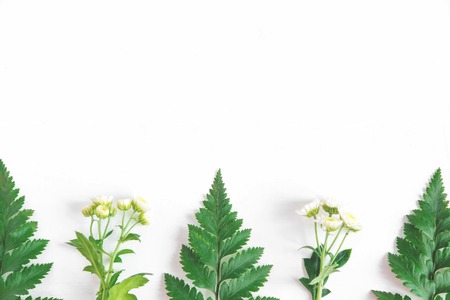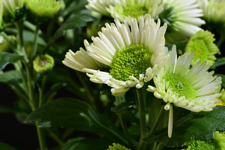 White chrysanthemum flowers with green leaves closeup.