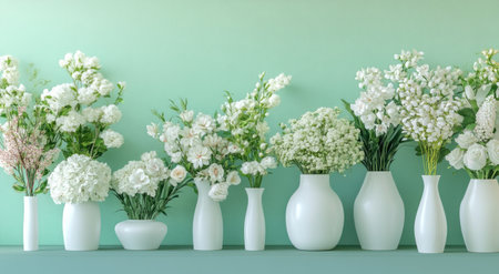 Mint green wall with white vases of flowers, a wedding photo backdrop or studio background. --ar 78:43 --v 6.1 Job ID: e2c70683-65e8-4d60-89bc-359f8c54b4cb