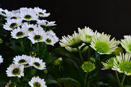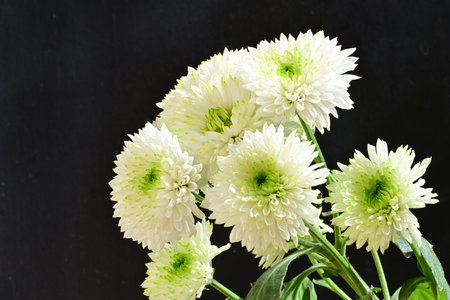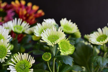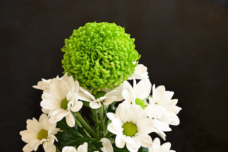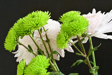 Green chrysanthemum bouquet on black background close up