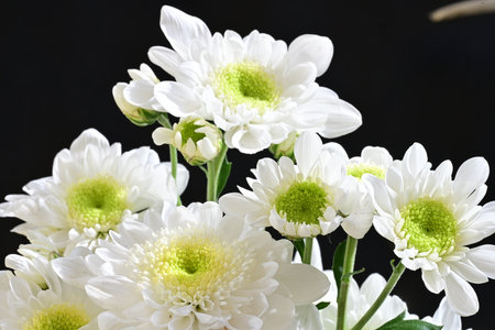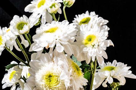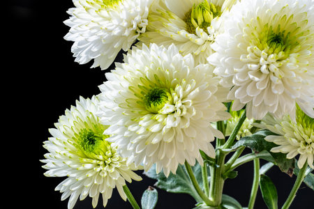 White chrysanthemum flowers isolated on black background. Close up.