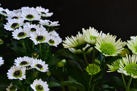 White chrysanthemum flowers on black background. Shallow depth of field