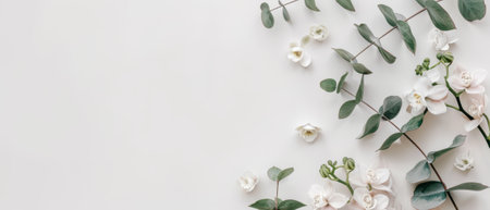 A minimalist floral arrangement featuring eucalyptus leaves and white flowers on a light background, perfect for modern and elegant designs.