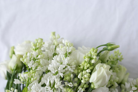 Bouquet of white lilac and lisianthus flowers on white background, wedding decor, bride bouquet, botanical photo