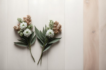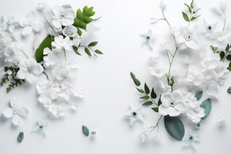 A delicate grouping of white flowers and soft green leaves rests on a pastel background. The elegant composition highlights natural beauty, perfect for decor or inspiration.