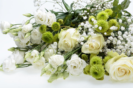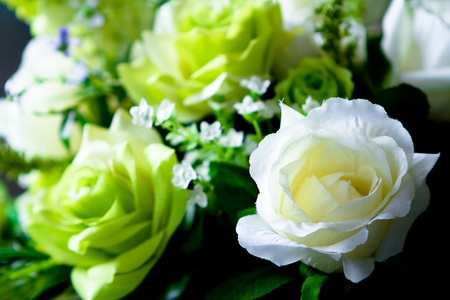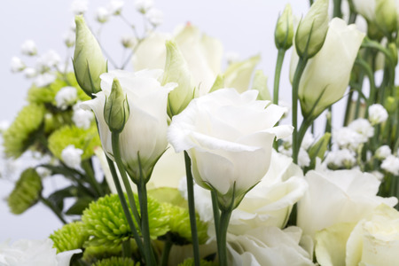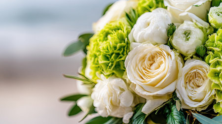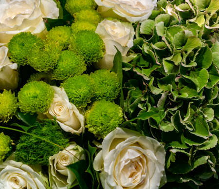 Beautiful bouquet of white roses and green flowers, macro bloom, valentine card
