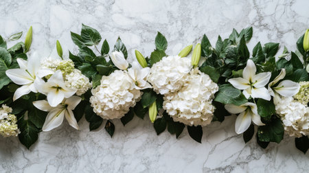 A serene funeral garland of hydrangeas and lilies viewed from above, displayed on a polished marble surface