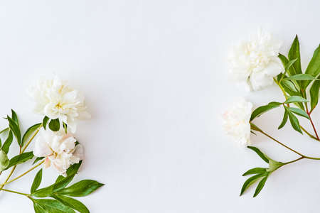 Flat lay composition with white peonies on a white background