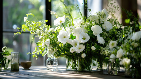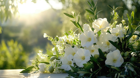 A stunning arrangement of white flowers accompanied by lush greenery, softly illuminated by natural sunlight, creating a serene and elegant atmosphere.