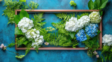 A stunning floral arrangement featuring white and blue hydrangeas beautifully framed by lush green foliage on a rich textured background. Perfect for nature-inspired decor.