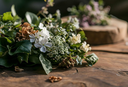 This captivating image showcases a stunning floral arrangement featuring elegant white flowers and lush greenery, illuminated by natural light in a charming rustic setting.