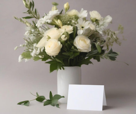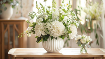 A white and green flowers are arranged on a table, AI