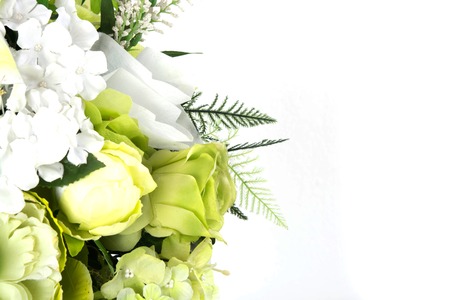 White flowers, roses, lily, gerbera over green background. Valentines day, Woman day concept. Spring or summer banner with copy space.