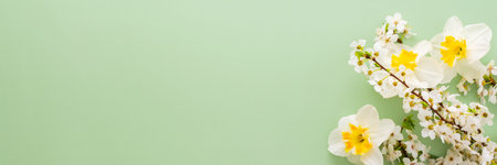 Festive banner with spring flowers, white daffodils and flowering cherry branches on a light green pastel background