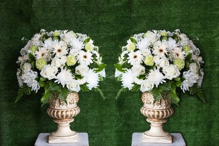 Decorative artificial flowers on green back ground