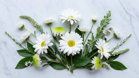 A delicate arrangement of white daisy flowers and green foliage with small green accent flowers on a light marble surface.