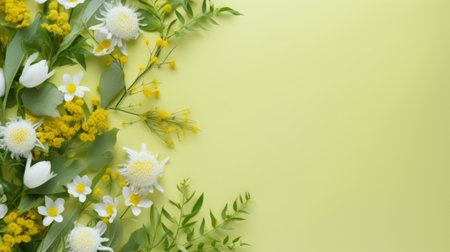 A mix of white and yellow flowers arranged on a pastel yellow background for a soft aesthetic.