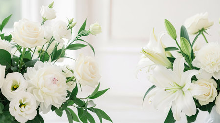 Two bouquets of white flowers are displayed in this image, showcasing roses, lilies, and other blooms. The composition highlights the textures of the petals and leaves against a blurred, bright background, suggesting a clean and airy environment. This image is suitable for various commercial uses, including advertisements and editorial content.