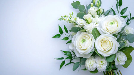 A white rose bouquet green leaf wedding flower bridal bouquet minimal floral romantic soft focus pastel elegant arrangement copy space white