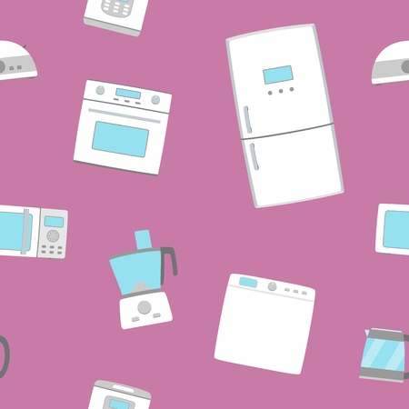 Home appliance set seamless background: TV, refrigerator, conditioner, dishwasher, oven, kettle, iron, multicooker, blender, mixer, vacuum cleaner, washing machine, microwave toaster Vector illustration